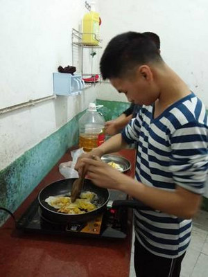小小廚師計劃的成果:男孩正炒蛋款待到訪「和平家」的客人呢!